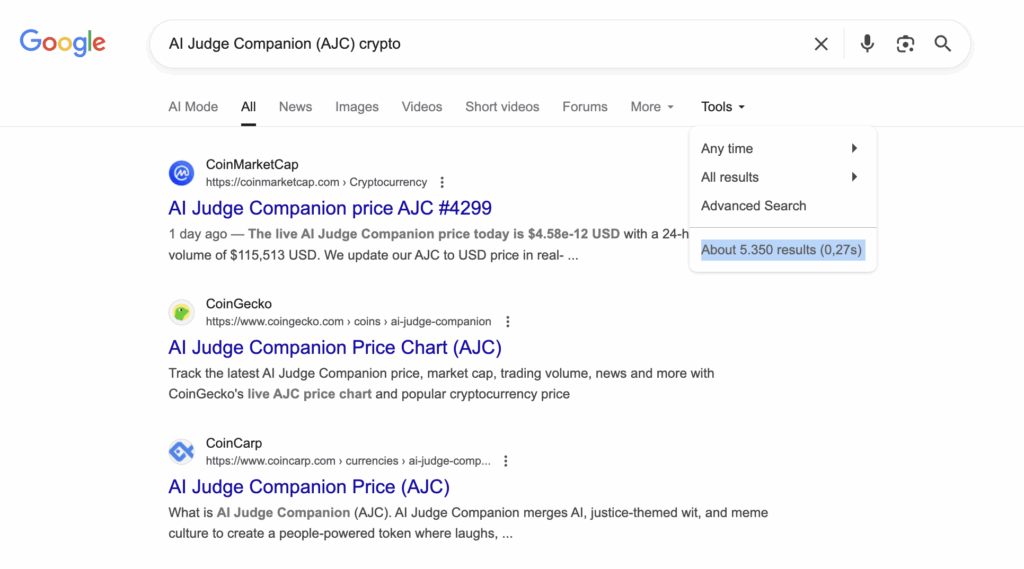 We analyzed Google search visibility for “AI Judge Companion (AJC) crypto” and found approximately 5,350 indexed results. From an analytical standpoint, this indicates a modest level of online presence. While not particularly high, it suggests that the project has started to gain visibility across listings and aggregator platforms like CoinMarketCap and CoinGecko. For a meme-based token, this level of exposure reflects early traction but still limited mainstream recognition. As coverage expands and social engagement grows, the project could strengthen its credibility and trust factor, potentially supporting future market growth.
