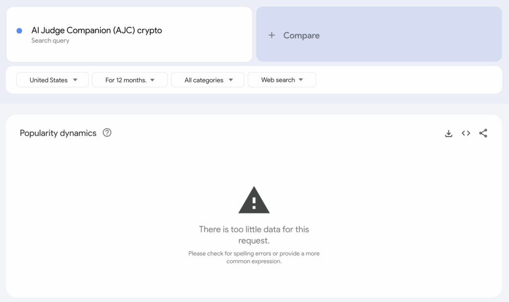 We analyzed Google Trends data for “AI Judge Companion (AJC) crypto” and found that there is currently too little search activity to generate measurable results. From an analytical perspective, this indicates extremely low public awareness and limited traction beyond niche crypto circles. Such results are typical for newly launched meme tokens that haven’t yet achieved mainstream exposure. To build stronger visibility and investor confidence, AJC will need targeted marketing efforts, social media virality, and community engagement to move from obscurity to broader recognition.