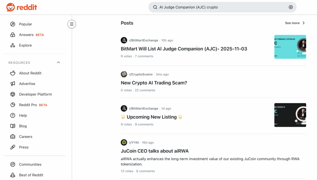 he Reddit activity for AI Judge Companion ($AJC) indicates a project in its immediate infancy, with the conversation dominated by its imminent exchange listing rather than organic community discussion or project utility.