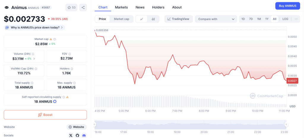 Animus (ANIMUS) shows strong early liquidity but unstable market behavior typical of speculative post-launch phases. Despite a visionary concept merging AI and blockchain, its low visibility, weak community engagement, and high volatility limit short-term growth potential. The project’s minimalist branding and developer focus position it as an experimental infrastructure play rather than a retail-driven asset. Long-term success will depend on real adoption of its AI autonomy framework and broader awareness beyond the niche tech audience.