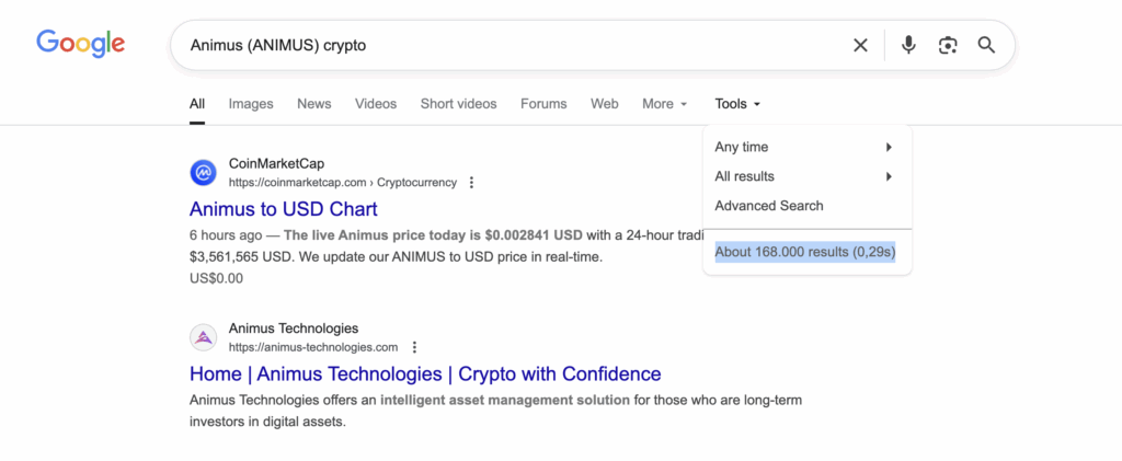 We analyzed Google search visibility for “Animus (ANIMUS) crypto” and found about 168,000 indexed results. From an analytical standpoint, this represents a relatively low level of online presence. Such a result count suggests that the project is still in its early exposure phase, with limited media coverage and brand awareness.