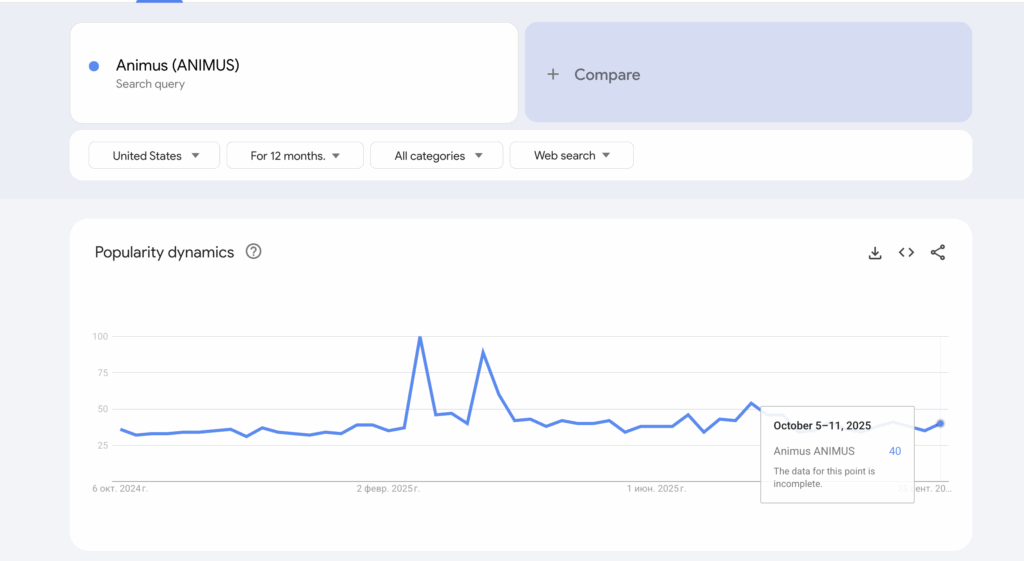 We analyzed Google Trends data for “Animus (ANIMUS)” and found an average interest level around 30-40, with a few short spikes reaching higher peaks earlier in the year. From an analytical standpoint, this indicates limited but consistent search activity.