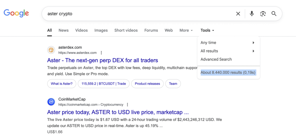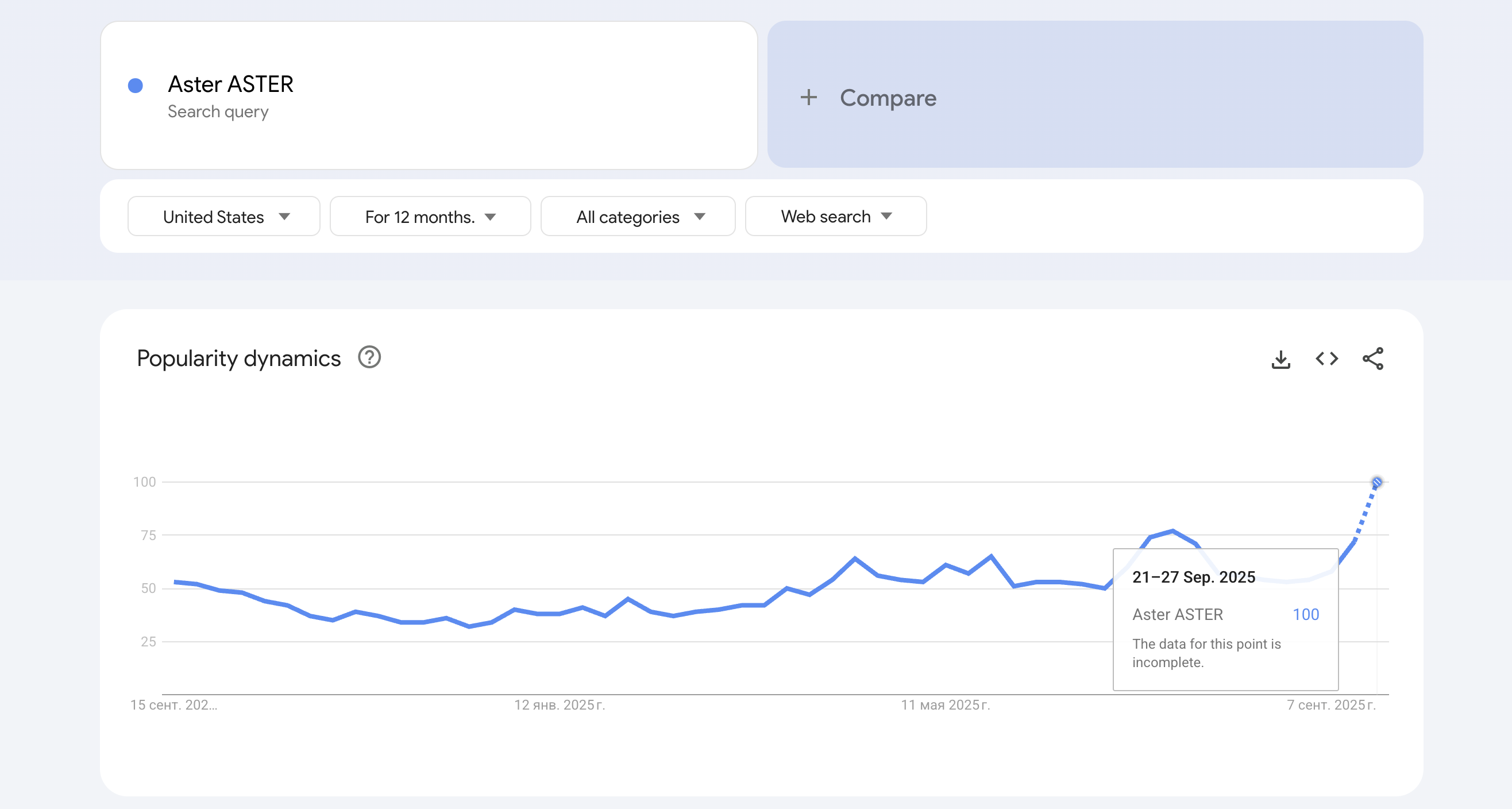 We analyzed Google Trends data for “Aster ASTER” and observed a clear upward trajectory, peaking at 100 interest score in late September 2025. From an analytical standpoint, this represents the maximum relative search popularity, which is a strong signal of rising awareness and market attention. For a newly listed asset, reaching peak search interest this quickly is notable. While it doesn’t guarantee long-term adoption, such momentum suggests strong short-term visibility and growing community curiosity – definitely on the higher side compared to many early-stage projects.