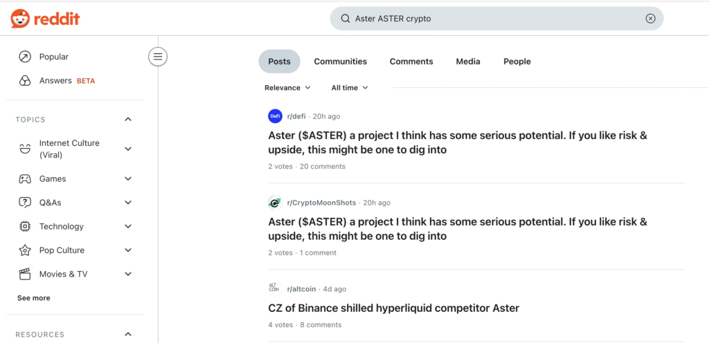 While specific individual user posts with identifiable names are not readily available from the analyzed data, the collective sentiment is quantifiable and largely positive. According to a social analytics report (Coinbase, Sept 21, 2025), ASTER is ranked #39 in social mentions, with 2,349 unique contributors and a social sentiment score of 4.0 out of 5. Twitter/X sentiment is particularly bullish, with 55.7% of tweets showing positive sentiment. On Reddit, ASTER was mentioned in 13 posts with 28 comments, though with fewer upvotes than downvotes on posts. This suggests a more cautious or mixed sentiment on Reddit compared to other platforms.