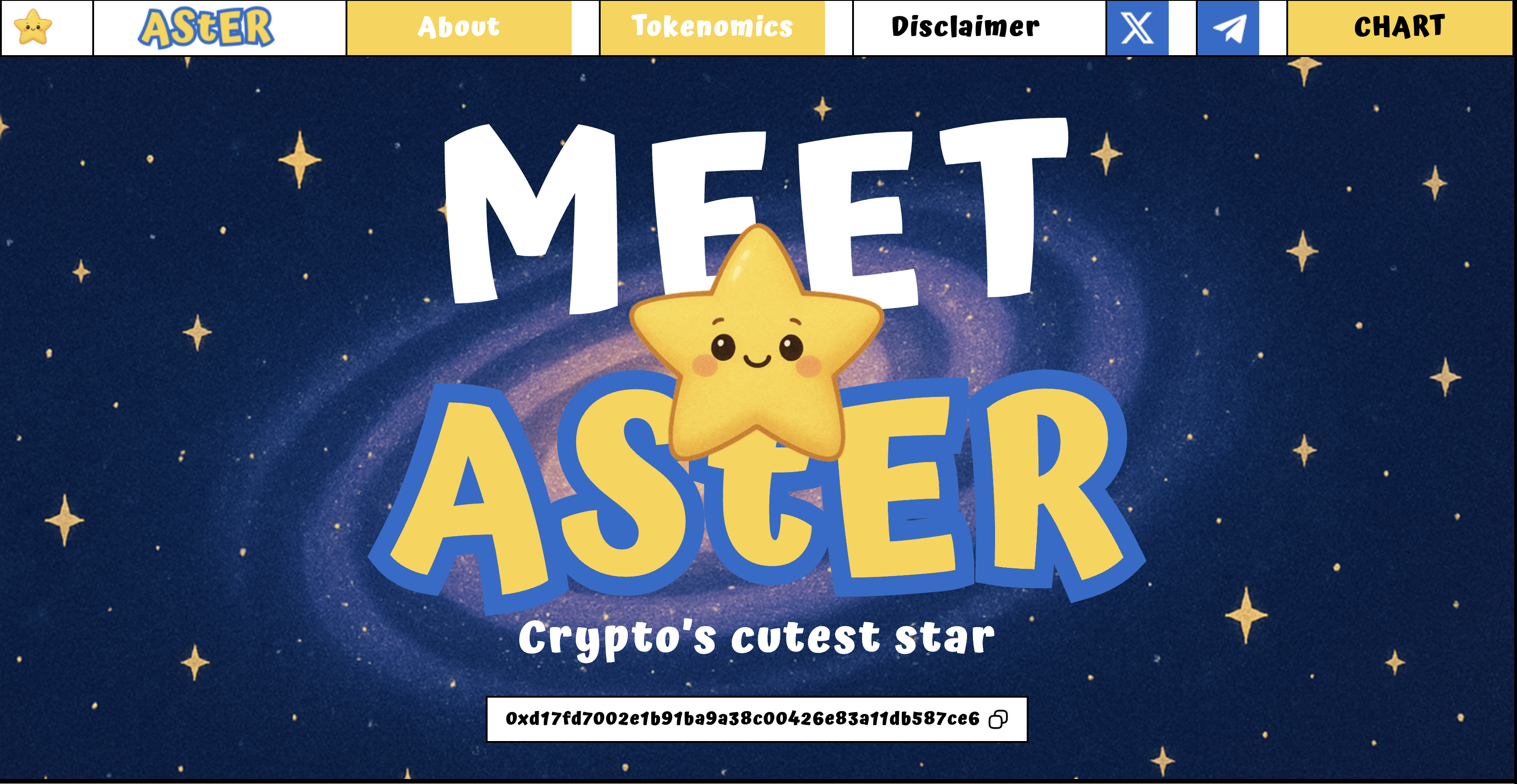 Comment: While the design is approachable and meme-friendly, the lack of detailed ecosystem features or strong fundamentals suggests ASTER is driven by branding and speculation. Its growth potential depends heavily on community engagement and hype cycles, not on underlying technology.