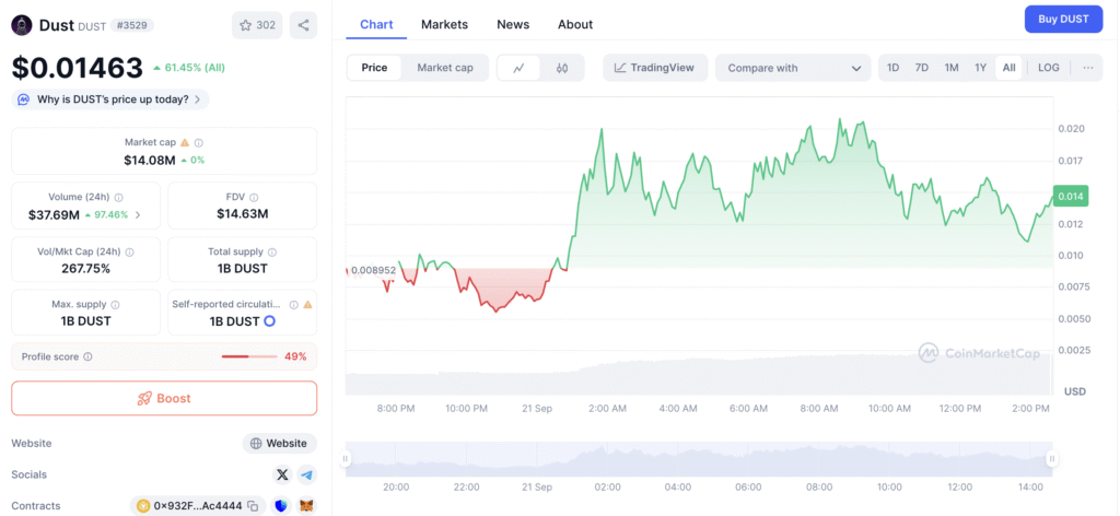 DUST shows strong early trading performance, with high volume, volatility, and a sharp price rally post-listing. Its unique DeFi-meme hybrid model, bonding curve launch, and solid UI give it technical depth beyond typical meme tokens. However, the lack of community engagement and social buzz is a major red flag for long-term sustainability. If momentum and volume persist, DUST could see another leg up – but without organic community growth, it risks fading after the initial hype.