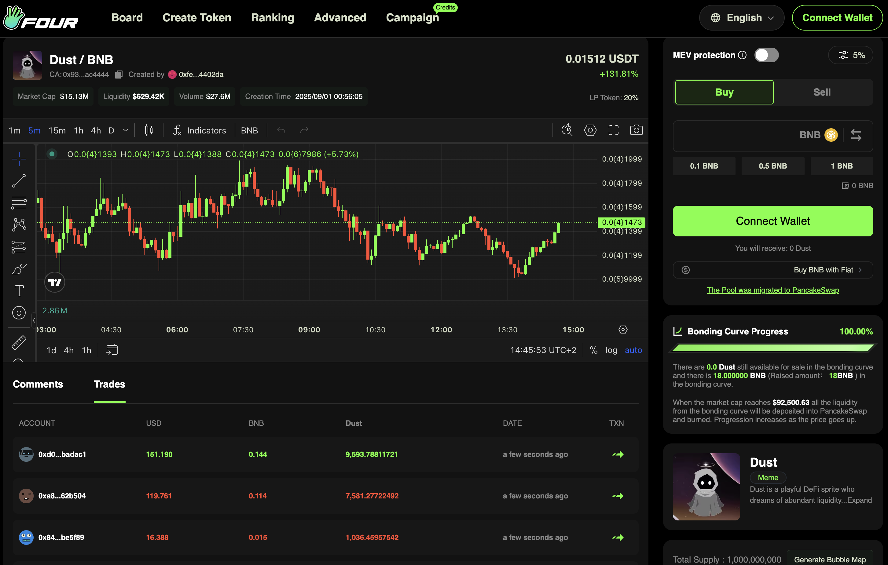 A 100% bonding curve sellout model – all tokens are initially distributed via curve pricing, then liquidity is auto-deposited into PancakeSwap. This ensures initial liquidity without VC/pre-mine. Visual LP migration and MEV toggle add transparency and trader tools rarely seen in meme tokens.