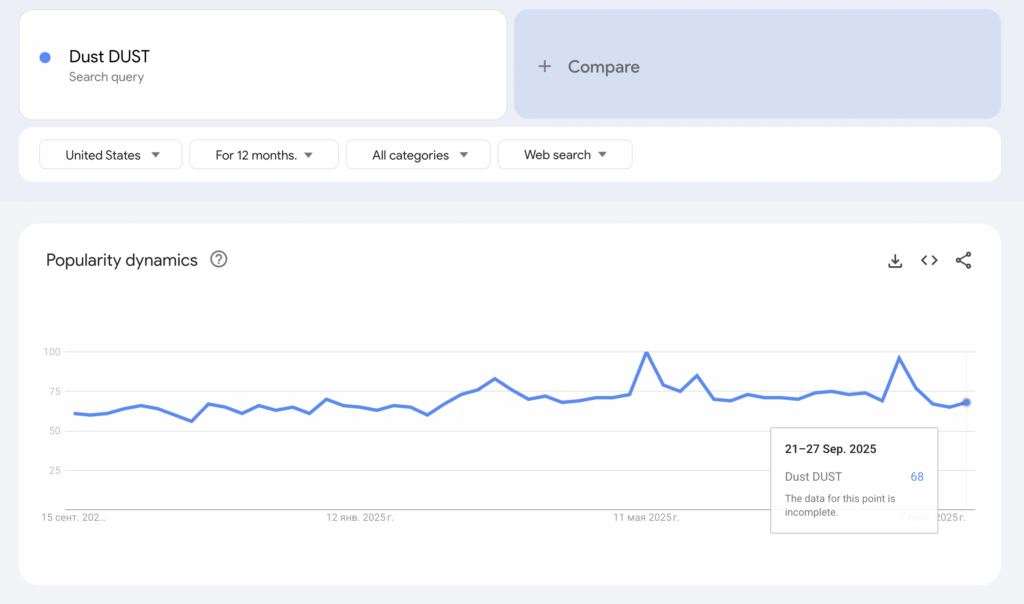We analyzed Google Trends data for the search term “Dust DUST” over the past 12 months in the U.S., and the results show a consistently strong level of interest, with values mostly ranging between 55 and 75, peaking a few times close to 100.