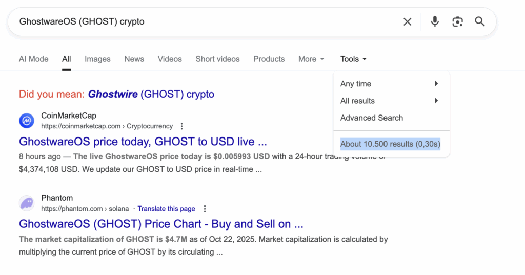 We analyzed Google search visibility for “GhostwareOS (GHOST) crypto” and found approximately 10,500 indexed results. From an analytical standpoint, this indicates a relatively low level of online exposure. Such a number suggests that the project is still in its early visibility phase, with limited media traction and community discussion. While this isn’t negative for a newly listed token, it means GhostwareOS currently lacks the broader recognition that typically drives organic growth and investor trust. As coverage expands and the project gains attention, higher search presence could significantly improve its credibility and market momentum.
