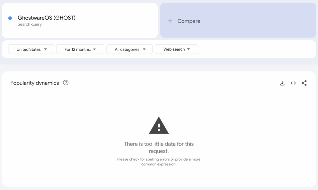 We analyzed Google Trends data for “GhostwareOS (GHOST)” and found that there is currently too little search activity to generate measurable results. From an analytical perspective, this indicates extremely low public awareness and minimal mainstream interest. Such a lack of data is typical for newly launched or niche projects but also highlights the need for stronger marketing and community engagement. Until visibility increases, the project’s exposure and adoption potential remain limited.