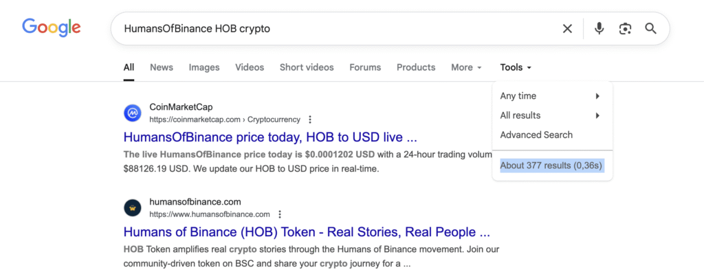 We analyzed Google search visibility and found about 377 results mentioning our cryptocurrency. From an analytical perspective, this is a very low figure for a newly launched project. Such limited coverage indicates weak awareness and minimal traction in broader markets. While not necessarily negative at the very start, it suggests the project is still under the radar. For stronger trust and growth potential, significantly higher search visibility and broader media exposure will be needed.