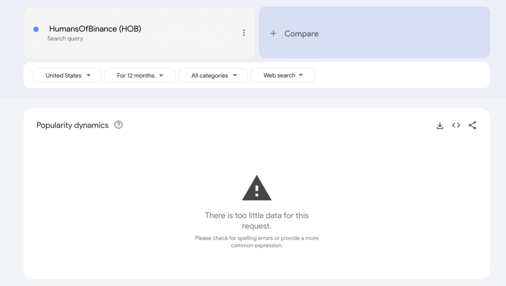 We analyzed Google Trends data for “HumansOfBinance (HOB)” and found too little data to generate a popularity chart. From an analytical perspective, this indicates very low search interest and limited public awareness at this stage. For a new project, such minimal visibility suggests it has not yet captured mainstream attention. To build trust and attract investors, stronger community traction and broader media presence will be essential.