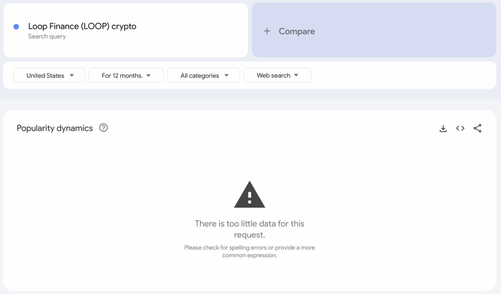 We analyzed Google Trends data for “Loop Finance (LOOP) crypto” and found that there is currently too little search activity to generate measurable results. From an analytical standpoint, this indicates very low public awareness and limited mainstream traction. While Loop Finance has strong online visibility overall, the lack of search volume suggests minimal retail interest or organic hype at this stage. To strengthen long-term visibility, the project will likely need consistent marketing efforts, exchange exposure, and community engagement to convert recognition into active attention.