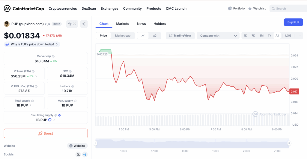 This visibility suggests that PUP has already achieved mainstream traction and is actively discussed or listed across major aggregators. In general, projects with over 10 million indexed results tend to show strong trust signals and growing brand recognition – a bullish indicator for continued community attention and potential price momentum.