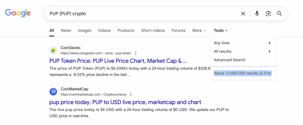 We analyzed Google search visibility for “PUP (PUP) crypto” and found about 13,600,000 indexed results. From an analytical standpoint, this is a very strong level of online presence. Such a large number of search results indicates broad awareness, high media exposure, and strong engagement across crypto platforms.