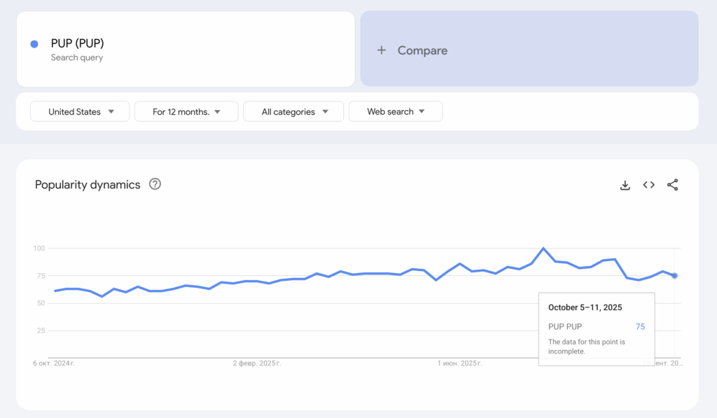 We analyzed Google Trends data for “PUP (PUP)” and found a consistent popularity score averaging between 65 and 80 over the past year, with a current value of 75. From an analytical perspective, this represents a strong and sustained level of public interest.