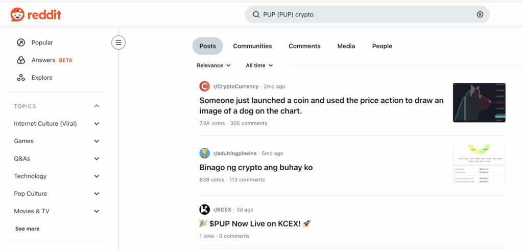 The Reddit threads for PUP (PUP) primarily center on its market presence and trading activity.