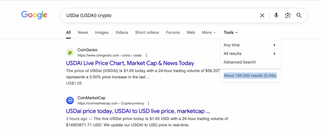 We analyzed Google search visibility for USDai (USDAI) and found about 164,000 indexed results. From an analytical perspective, this represents a moderate to strong level of coverage for a recently listed token. While it is not on the scale of major stablecoins with millions of mentions, it is significantly higher than the early footprint of smaller projects. This level of search presence suggests that USDAI is already gaining traction and visibility within the crypto ecosystem. Overall, the result is positive, indicating growing awareness and credibility, which can support further adoption if reinforced by community and institutional engagement.