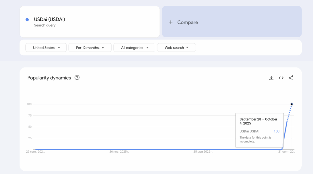We analyzed Google Trends data for USDai (USDAI) and observed a sudden spike to 100 interest level during the week of September 28 – October 4, 2025. From an analytical perspective, this indicates a sharp breakout in visibility, showing that the project has just entered the public radar. While sustained data is not yet available, hitting a peak score of 100 suggests that USDai successfully attracted strong short-term attention. The key factor now will be whether this surge is sustained over time-if interest remains high, it could translate into stronger adoption and credibility, but if it quickly fades, it may reflect temporary hype.