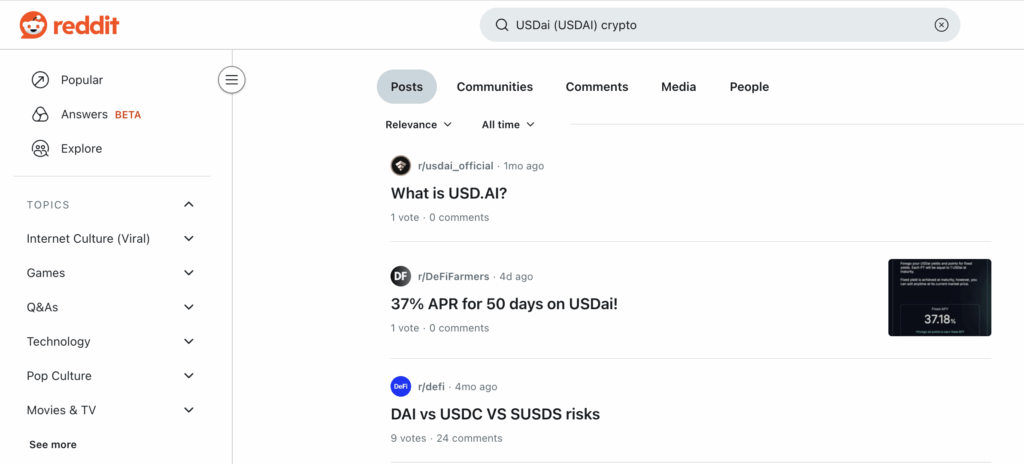 Based on the provided Reddit screenshot for the query “USDai (USDAI) crypto,” the social media presence for the asset is minimal and highly contained.