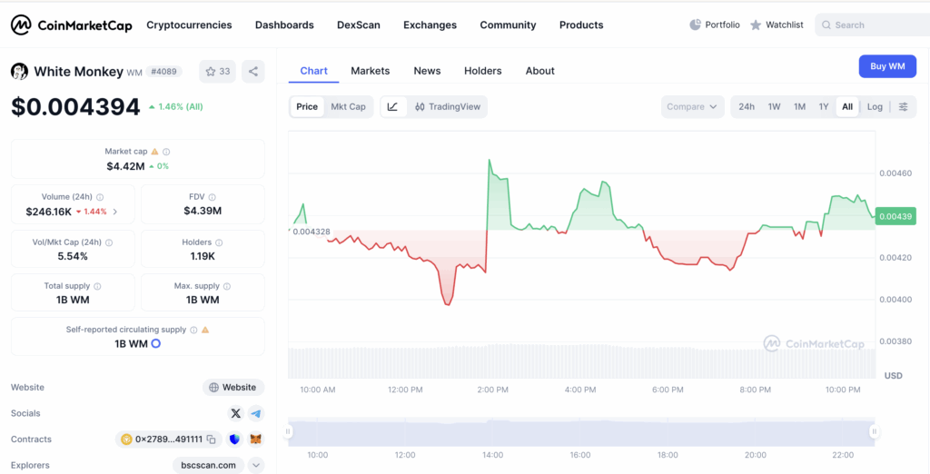 Comment: White Monkey (WM) demonstrates a healthy early market with moderate liquidity and controlled volatility. The absence of sharp selloffs and consistent trading volume suggest organic participation and stability typical of a well-balanced meme token launch.