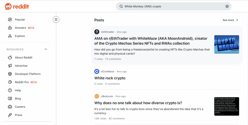 The Reddit data for “White Monkey ($WM)” shows minimal, fragmented activity, primarily connecting the name to an NFT/RWA creator rather than a high-volume, standalone token.